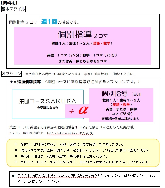 個別学習コースSeekから、途中で集団指導コースSAKURAにコース変更を希望される 場合は、一度、個別コースの担当教師にご相談ください。現状の成績や授業に対する姿勢、理解 度を総合的に判断して「集団コースの授業についていける」と判断されれば、コース変更が可能 です。またコース変更前に、集団コースの体験授業を無料で受講することができます。
