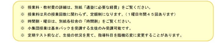 できます。個別学習コースSeekでは得られない集団授業の中での楽しさ、黒板を使ったプロのわかりやすい授業、同じ志を持って頑張っているライバルから受ける刺激、時には緊迫した空気に包まれる教室の雰囲気…集団授業ならではの良さを感じるチャンスです。ご希望のタイミングで担当教師と相談し、大いに参加してください。授業料は塾生価格でご提供いたします。